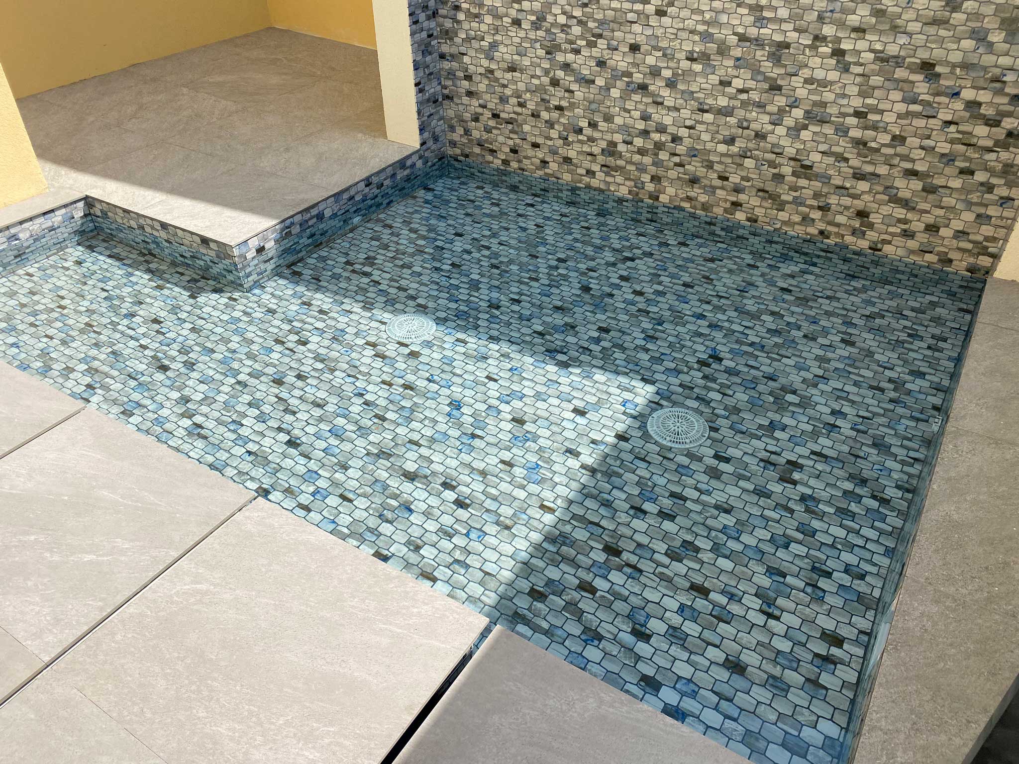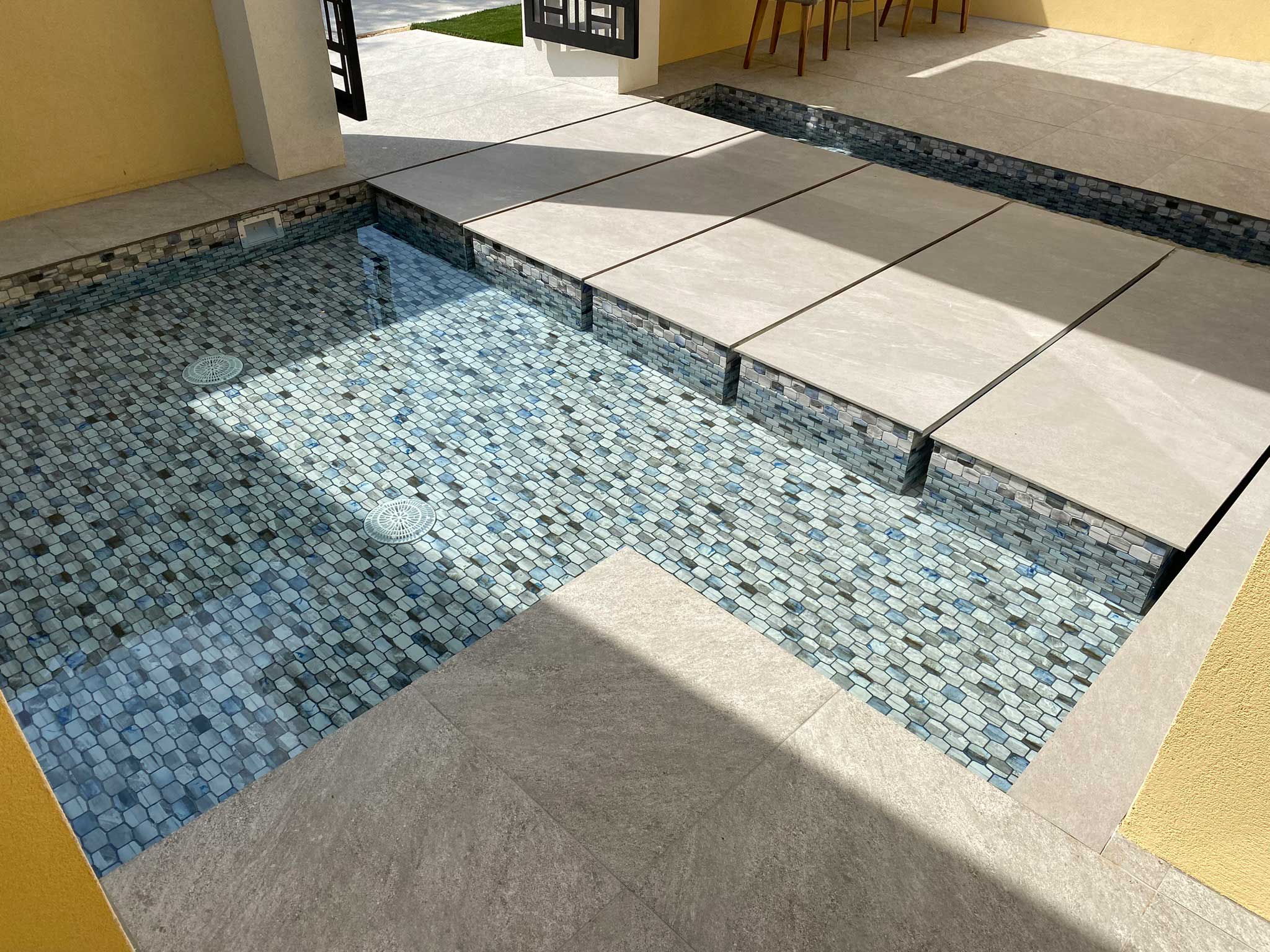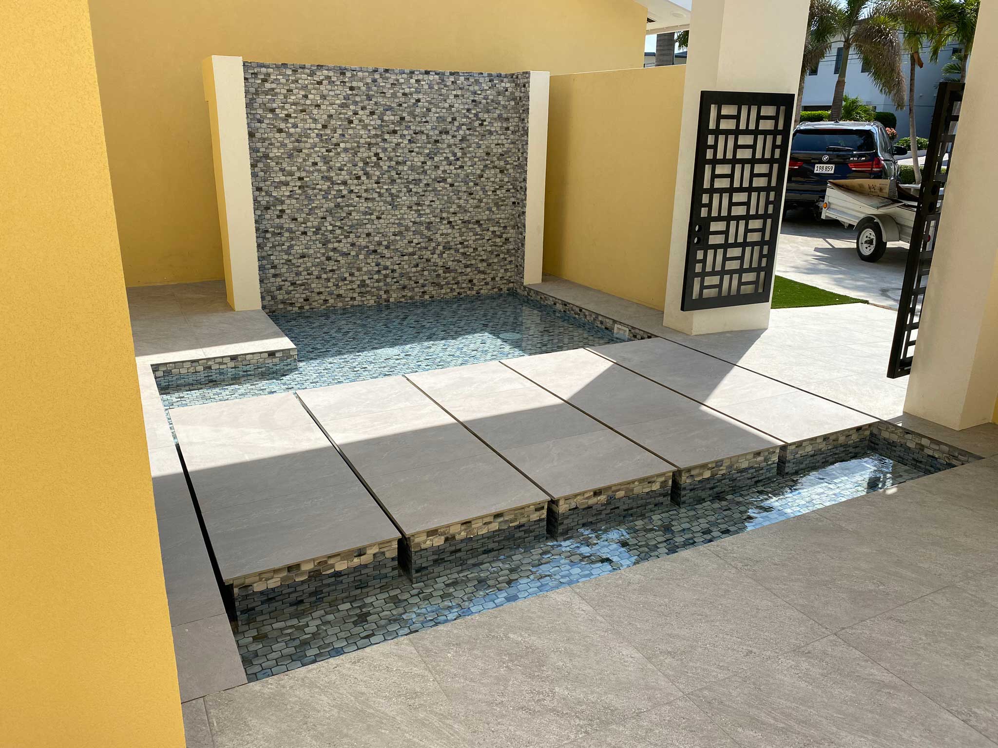 This project showcases the creative possibilities when you entrust water-related home decor to a pool construction expert. The entrance features a sophisticated mini pool with a tranquil waterfall, designed to captivate from the moment you arrive. The pathway to the home is crafted with individual island steps, each meticulously placed to create the illusion of walking on water. The subtle circulation of water between these sleek, rectangular tiles adds a dynamic yet serene touch. This elegant design not only elevates the entrance but also highlights the power of thoughtful, water-inspired decor to make a lasting impression.