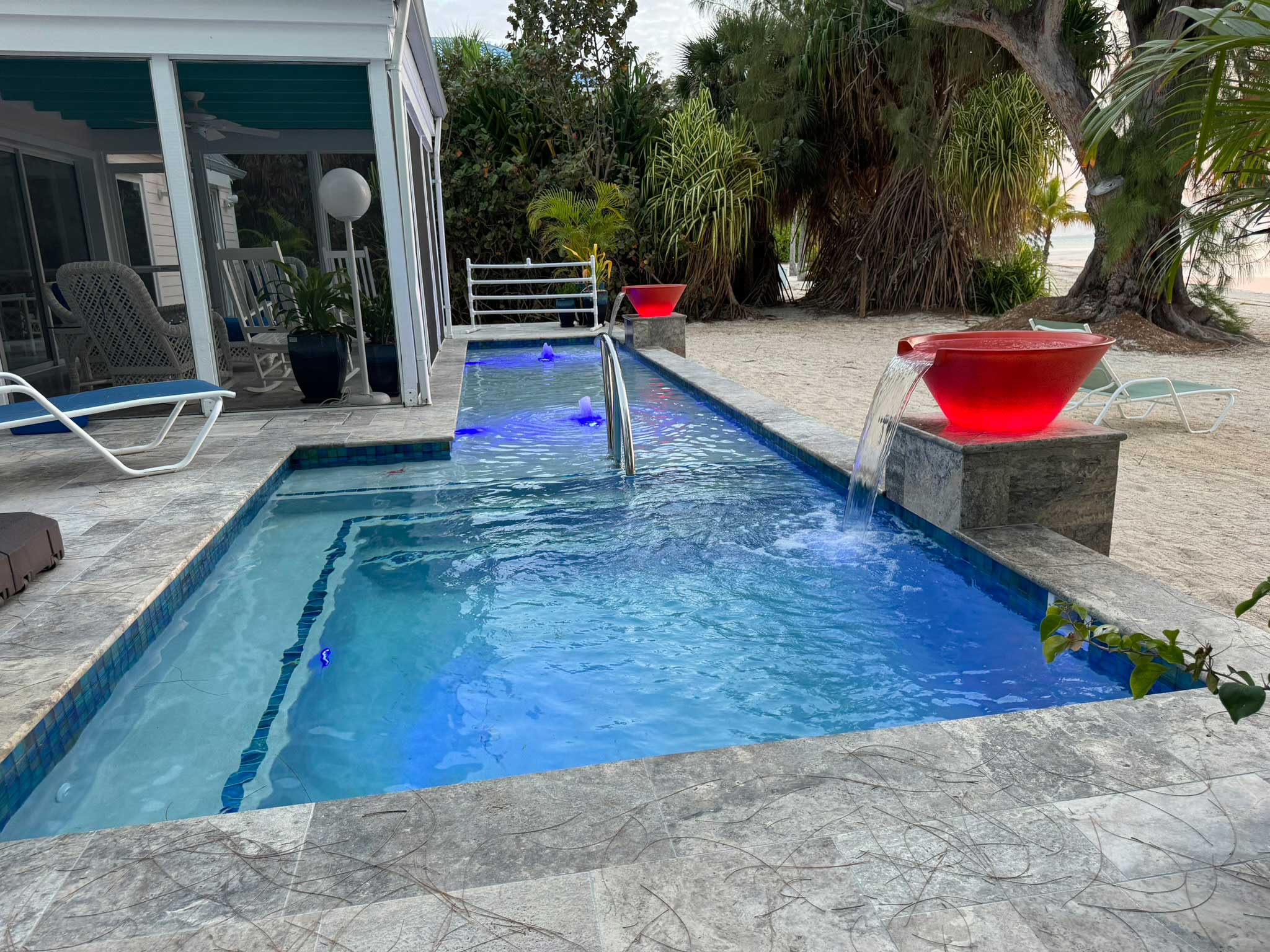 This stunning L-shaped pool wraps elegantly around the patio of a luxurious oceanfront home, designed for ultimate relaxation and sophisticated sunbathing. The pool, while shallow, offers an expansive area for lounging, with a luxurious jacuzzi perfectly integrated into the design. The pool is adorned with numerous water features, including two stylish corner bowls that resemble plant pots but instead cascade water into the pool while shifting through a vibrant array of colors at night.