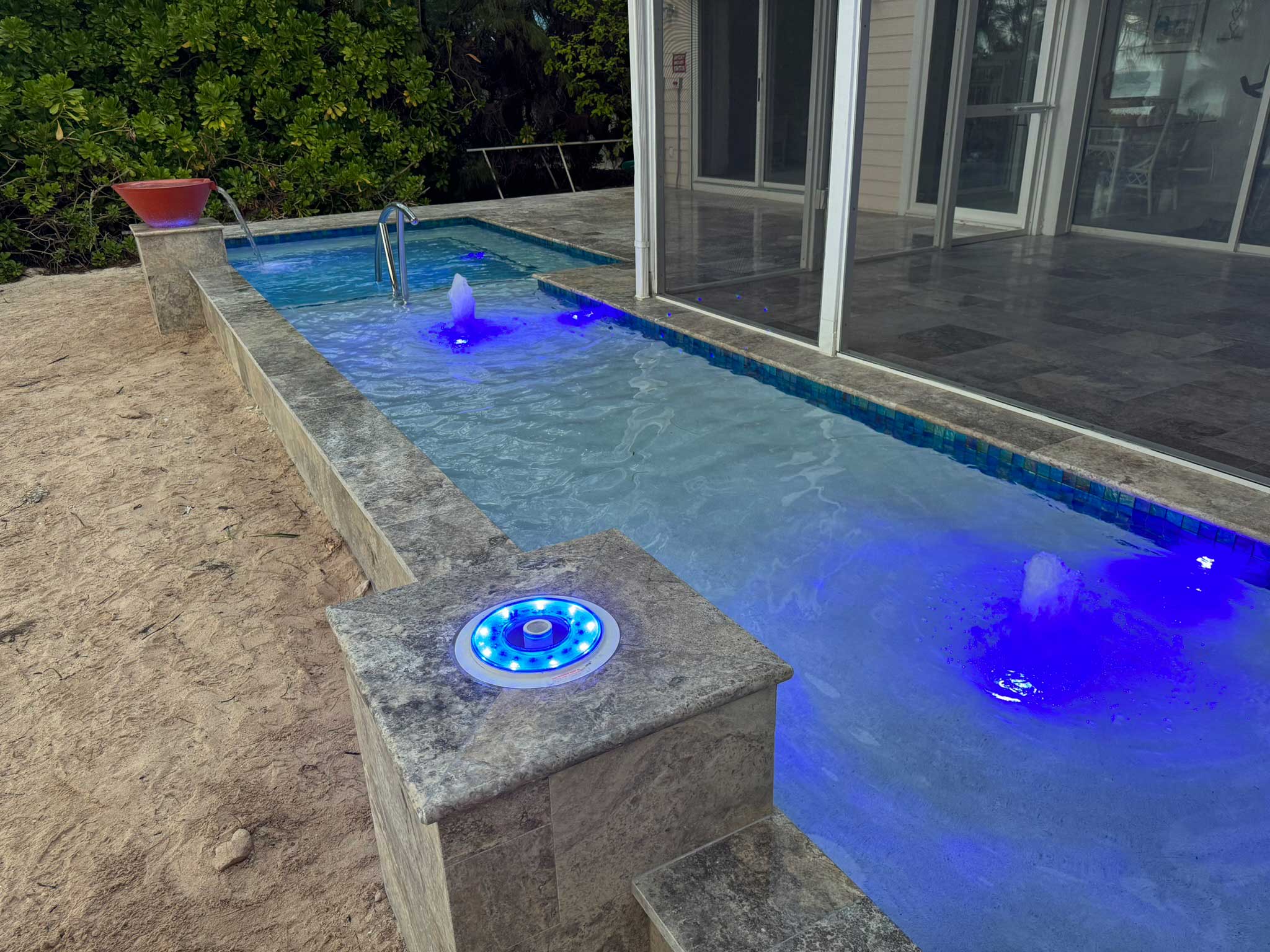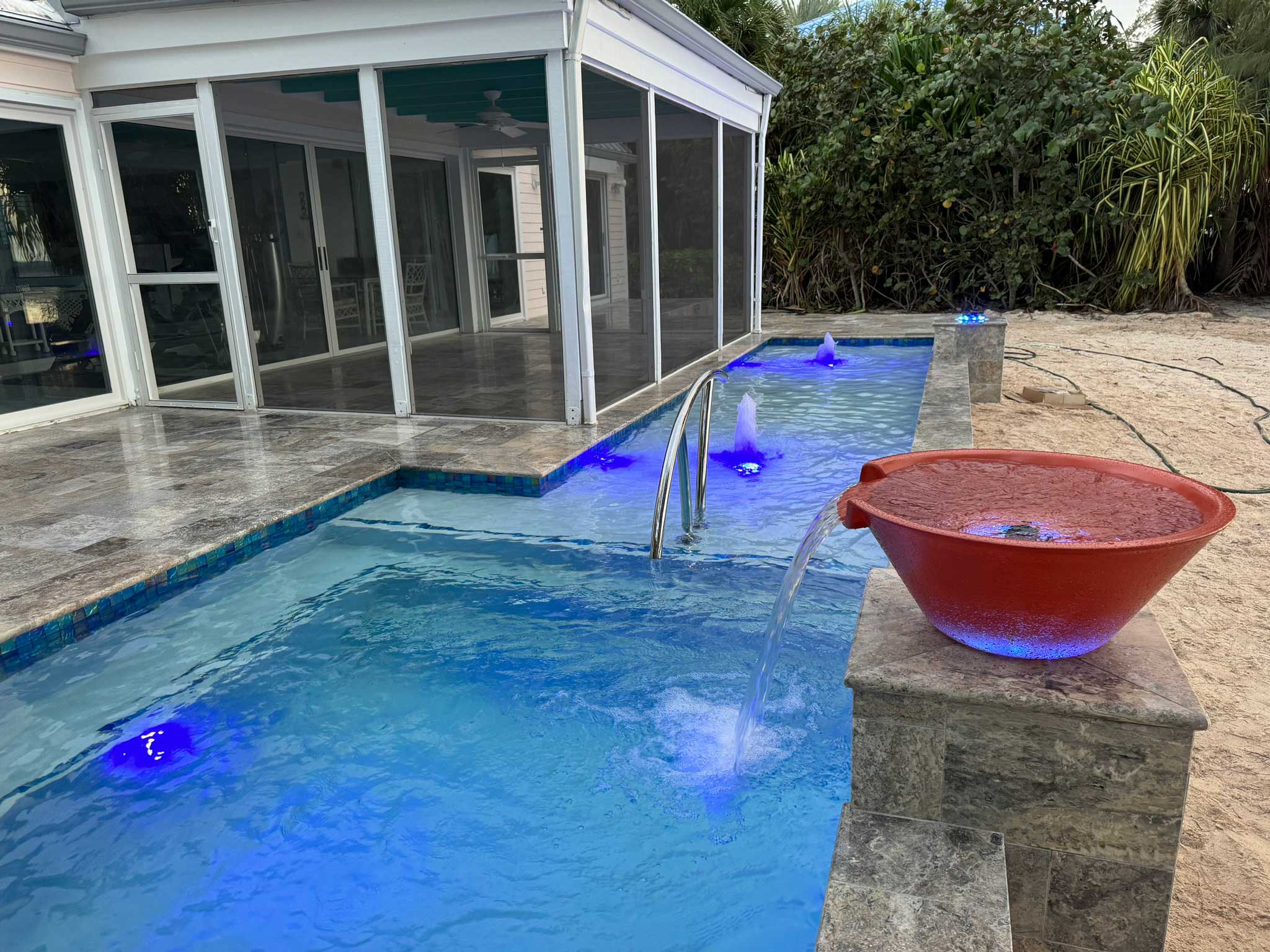 L-Shaped Pool, Jacuzzi, Color-Changing LED Lighting, Decorative Water Bowls